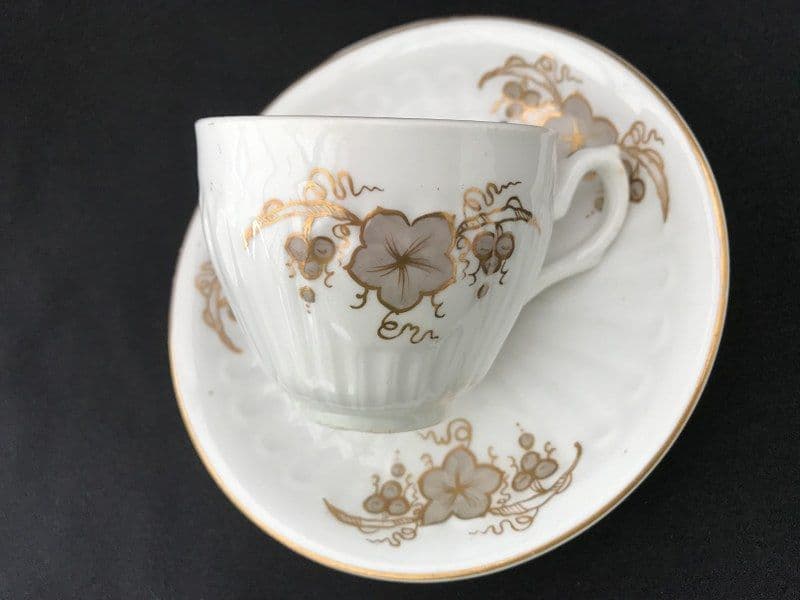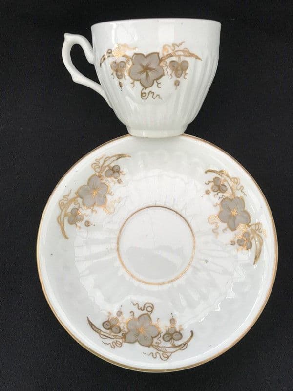 Ribbed cup and saucer with plain edges. Hand painted floral design in grey and gilt. Pattern number 3/545