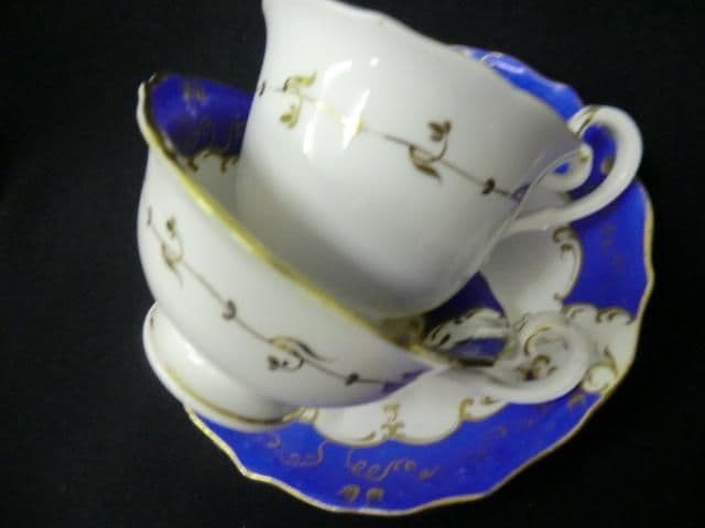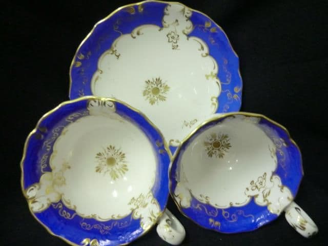 Although unmarked we believe this is a Coalport scroll handled trio and in pattern 3/82 which we also have in lemon on an adelaide shaped set. Royal blue and with gilt floral and sunbursts to interior base of cups, saucer centre,handle areas. Minimal signs of gilt / pattern wear