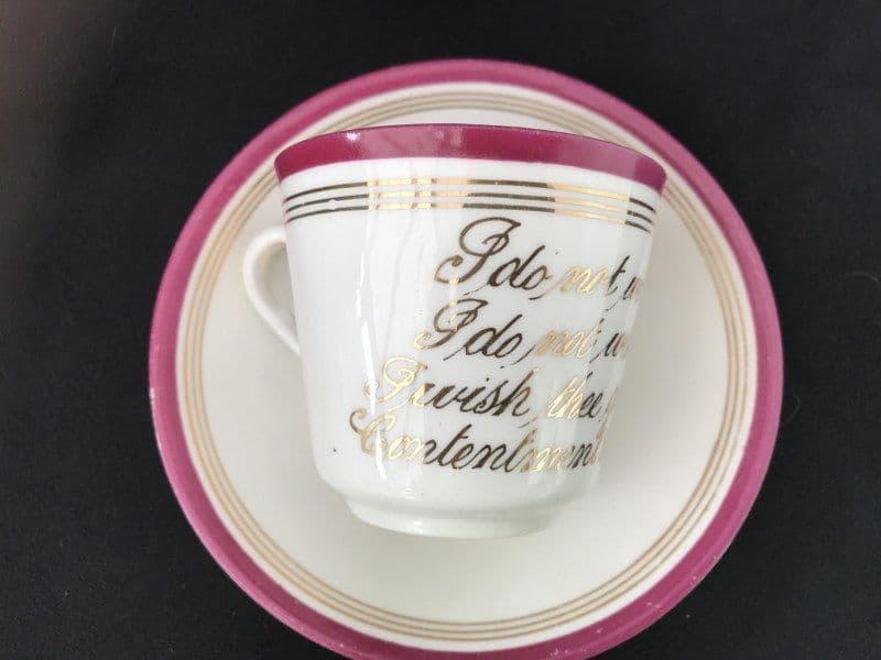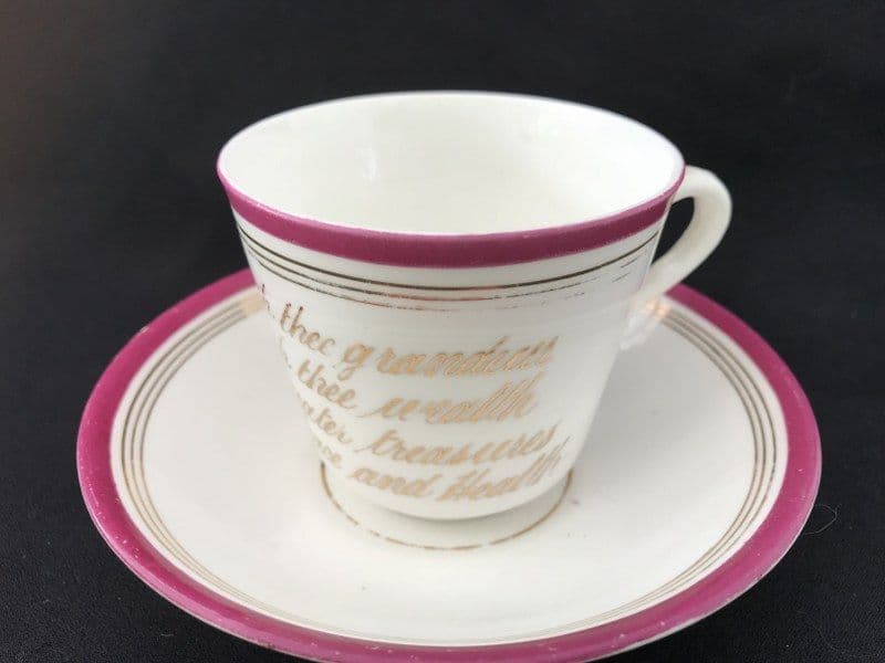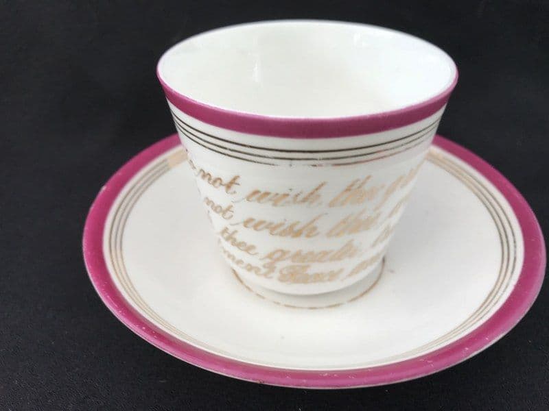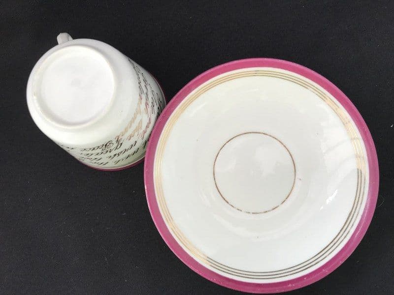 A Victorian 'Motto' cup and saucer with a verse hand written in gilt. Pink rims.