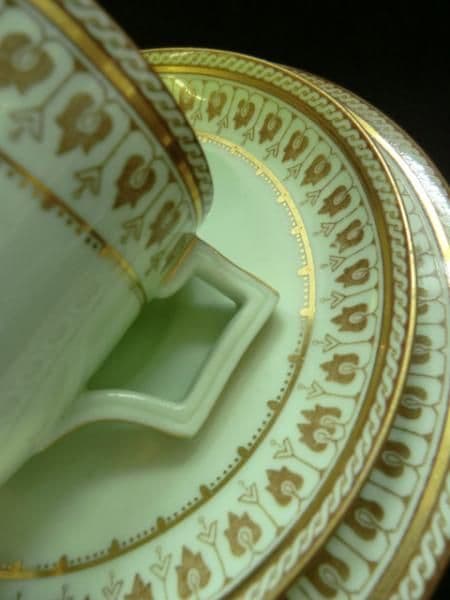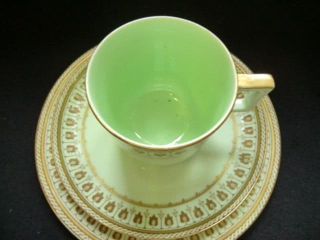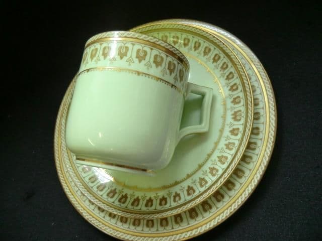 A celadon ground tea trio with elegant borders detailed in gold. Straight sided cup with angular handle. This service was reputedly made from the same clay as used to make the famous 'Earth' Vase which was display at The Crystal Palace exhibition in 1884.Nice quality, understaed sets in good condition with minimal signs of wear